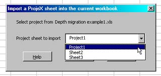 Having selected the workbook a new dialog lists the ProjeX sheets in the workbook as a pull down list from which to select the sheet to import to our current workbook.