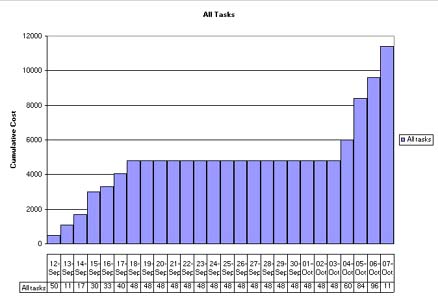 In this case we have assigned a cost of $300 a day to dig the foundations. We can repeat this process for each of our task. If a task does not have a cost (for example while the concrete is curing are workers are on another site so there is no cost) then we just leave the cost as zero. Having defined the costs we can generate the cost plot and table for the project (don't worry if you don't have a resources file, just create a dummy one when ProjeX requests it). From the menubar: