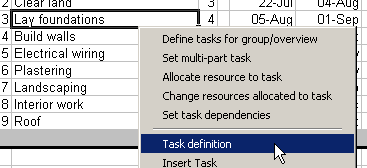 [ WAA Home | ProjeX Home | Download ProjeX | Help using ProjeX | ProjeX FAQ | About WAA]Attaching costs to a taskTraditionally ProjeX works with costs that are allocated as part of a resource. for example a mechanical digger could be defined as a resource with a cost of $500 a day. We can then allocate that resource to a given project task (eg digging the foundations for a tower) and so that cost will show up as part of that task. For some tasks it can be more convenient to attach a cost directly, for example we might be subcontracting the foundation work out to another company with a total price $1000. ProjeX now includes this functionality as well as combining the two (we might also attach the cost of the site foreman to make sure the subcontractor is doing the work correctly). So, how do we do it? Lets look at the house building project we used in the critical path example. Using the right mouse button to select a task from the project sheet we can select the 'Task definition' option to set the task up.