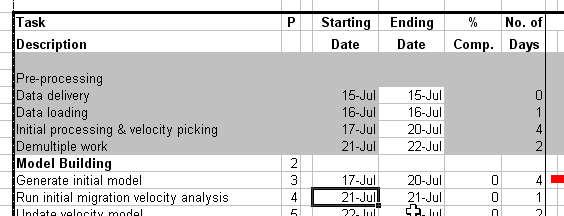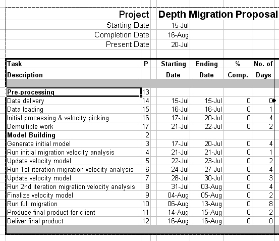 Also the task 'Run full migration' is dependent on BOTH the Demultiple work having been completed and the velocity model being finalized, we can set the task's start date formula to '=MAX(F23,F15)+1' , i.e. which ever is the greater task end date. As a final update, lets add a title for the last few tasks to be 'Produce Final Product'. We can now produce a new Gantt chart for our revised project plan. We need to alter the starting date for this project (still set to be the same as the example sheet that was automatically generated) to when we think it might actually begin. Lets say we expect the data to be delivered on July 26th, we can change the value of E12 to July 26. Because we have the starting dates of all the other tasks related by their formula, all the dates are updated. We can also turn on the 'Plot groups' option in the Display properties dialog to show the duration of the different groups of tasks