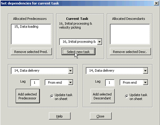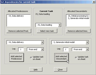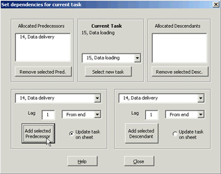 Initially we have no allocated predecessors (tasks on which this one is dependent on) and no descendants (tasks that are dependent on this one). In the bottom left we can set the tasks that this one is dependent on, the lag (currently in days), whether to update the project sheet (the starting date formula is set to give the dependency). In this case we want to set the dependency with 'Data delivery' so we press the 'Add selected Predecessor' button. The 'Data delivery' task now shows as a preceder. If required we can add more preceding tasks.