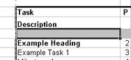 [ WAA Home | ProjeX Home | Download ProjeX | Help using ProjeX | ProjeX FAQ | About WAA]Adding Rows and Columns to a ProjeX sheetProjeX is very sensitive to where the task listing is on the Excel sheet and the column order of the tasks, dates and completions. It keeps track of where everything is on each sheet by storing an origin. This origin is the first cell on the sheet that will have a date label for the plot axis.