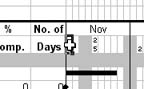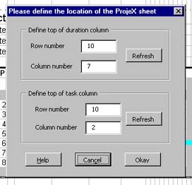The cell actively selected on the ProjeX sheet will be row 10, column 7 which is ProjeX's default position for the grayed out cell just above the top of the duration column if you change the row number by one and either hit the Refresh button or click on the column text box the selected cell on the sheet will shift to reflect the new coordinates. Adjust these parameters until the cell just above the first duration is selected. The same needs to then be done for the tasks, selecting the grayed out cell above the first task. This should give: