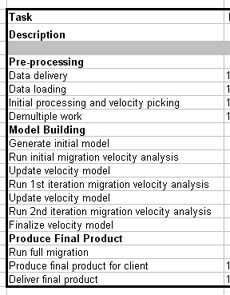 Above the two sets of tasks have been grouped and new 'task names' added at the top of each group. Note the pointer numbers must not be changed in any way otherwise the dependencies will be corrupted. We can now select the first of the new task titles ('Build and update velocity model') using the right mouse button and then select the 'Set multi-part task' from the pulldown menu.