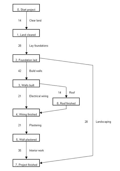 The above also has two activities that connect two nodes, the wiring and roofing are both activities between nodes 3 and 4. We need to insert a dummy activity here because we do not know which activity is first.